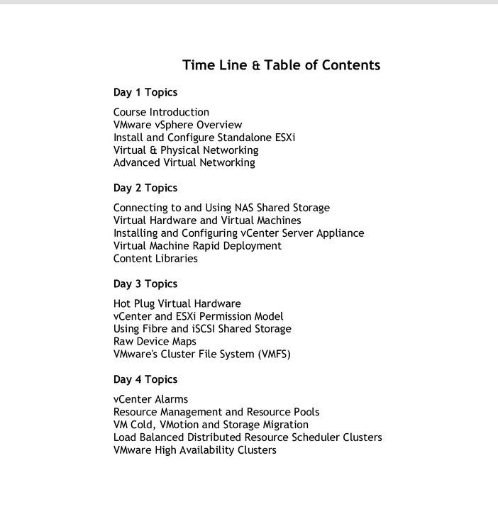 Assuming no prior virtualization experience, this class starts with the basics and rapidly progresses to advanced topics. It starts with the basic including installing, configuring and networking ESXi hosts. creating VMs, installing and configuring vCenter. It continues on by covering Virtual Machines, Permissions, storage, compute resource management, VM migration, building load balanced and failure recovery clusters, and more. Throughout the course best practices are provided, along with troubleshooting tips, and administrative short cuts.